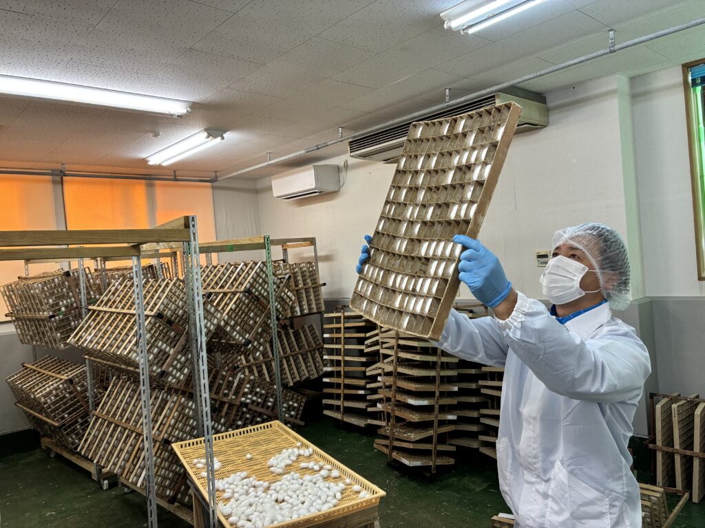 今回は11月下旬頃から約6万頭のカイコを人工飼料で飼育。順調に成長し、1回の飼育あたりで過去最高の生産量となりました。大きくしっかりとした繭が多く、質的にも最高のものが出来たと喜んでいます。